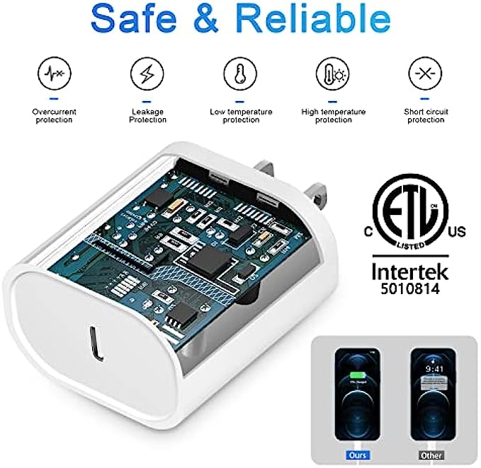 [Superior Safety Fast Charger]: 20W lightning charger has multipotent safety system ensures complete protection for your lightning devices. The ETL certified wall charger built-in over-voltage protection, features a stable voltage. the lightning cable built-in smart chip to match the current required by devices automatically.