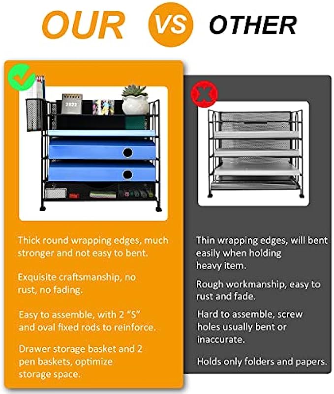 【Sturdy Durable】Paper organizer is made of lightweight durable steel wire mesh and reinforced and reinforced with a solid steel frame,very sturdy and will not fade or rust. Rubber anti-slip feet to prevent it from sliding or scratching surfaces. more stable and durable compared with many other similar products in the market.