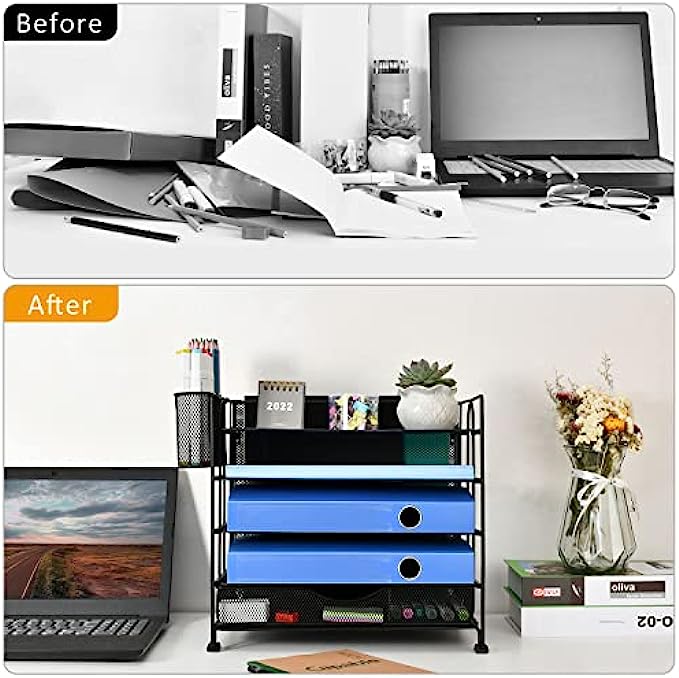 5 Tier Office Desk Organizer, Paper Letter Tray Organizer, Desktop File Organizer with Extra Drawer and 2 Pen Holders, Mesh Office Supplies Desk Organizer for Home Office