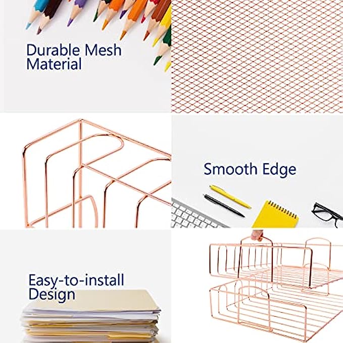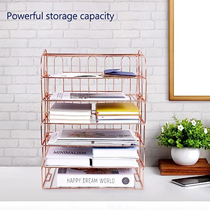 【6 Stackable Trays】-This rose gold desk organizer includes 6 file trays and one upper display shelf. Use this desk file organizer as individual trays or stack them to save more space. You can use them for one person or separate them for multiple people.