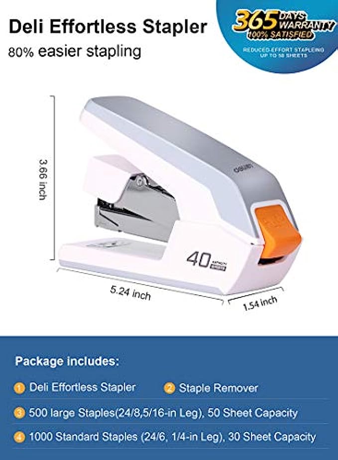 Deli Effortless Desktop Stapler, 40-50 Sheet Capacity, One Finger Touch Stapling, Easy to Load Ergonomic Heavy Duty Stapler, Includes 1500 Staples and Staple Remover