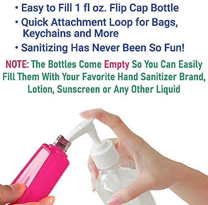 • ✅ CONVENIENT: 1 - Oz flip top cap bottles attache to purses, backpacks, key chains, gym bags or diaper bags. Wherever life takes you. EASY TO FILL! Convenient flip cap allows for easy filling from any large pump bottle.