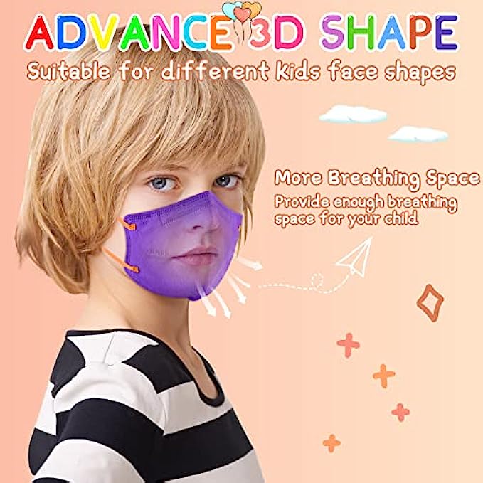 MULTI-COLOR KN95 KID MASKS: Sized at 5.51 inches x 7.08 inches, and the length of the ear loop is 3.2 inches, the stretched length is 7.5 inches. With 5 colors of KN95 kid masks: purple*10pcs, orange*10pcs, yellow*10pcs, green*10pcs, blue*10pcs, total 50 PCS kids face mask. Each kn95 mask comes with a different color ear loop, It can increase the fun of children wearing masks, matching various clothes to show their personality.