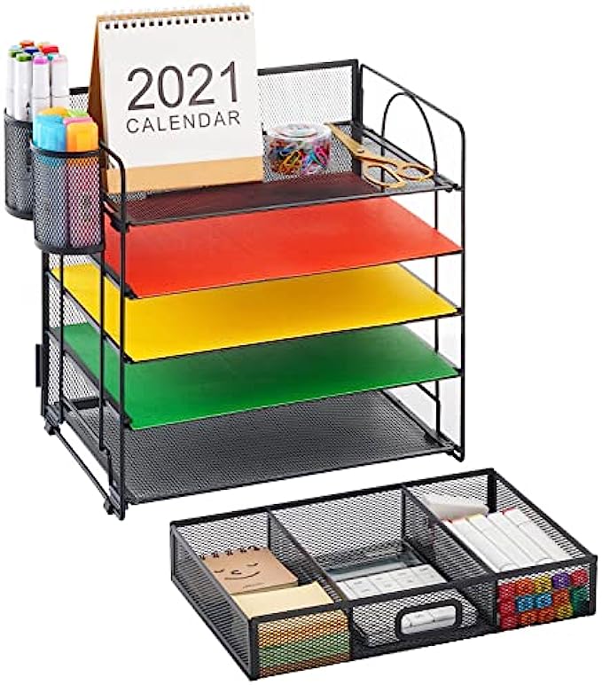 Marbrasse 5-Trays Desktop File Organizer with Pen Holder | Paper Letter Tray with Drawer and 2 Pen Holder | Mesh Office Supplies Desk Organizer for Home Office (Black)