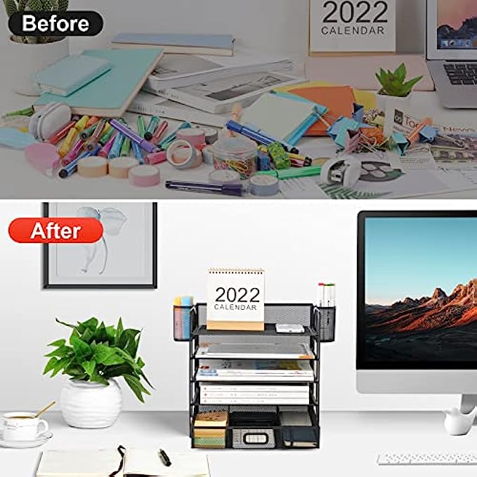 【Perfect Desktop File Organizer】Our Office Desk Supplies Organizer is made of 5 sliding trays + 2 Hanging Pencil Holders + 1 sliding drawer which has enough storage space to accommodate all office supplies, such as pens, pencils scissors, folders and Letter/A4 Size Paper.