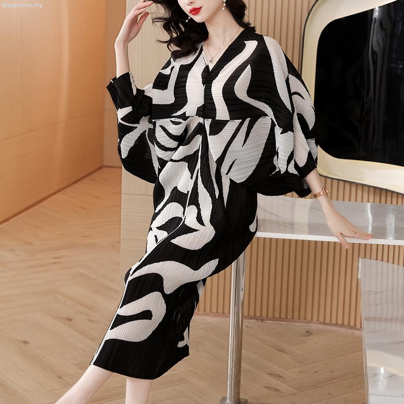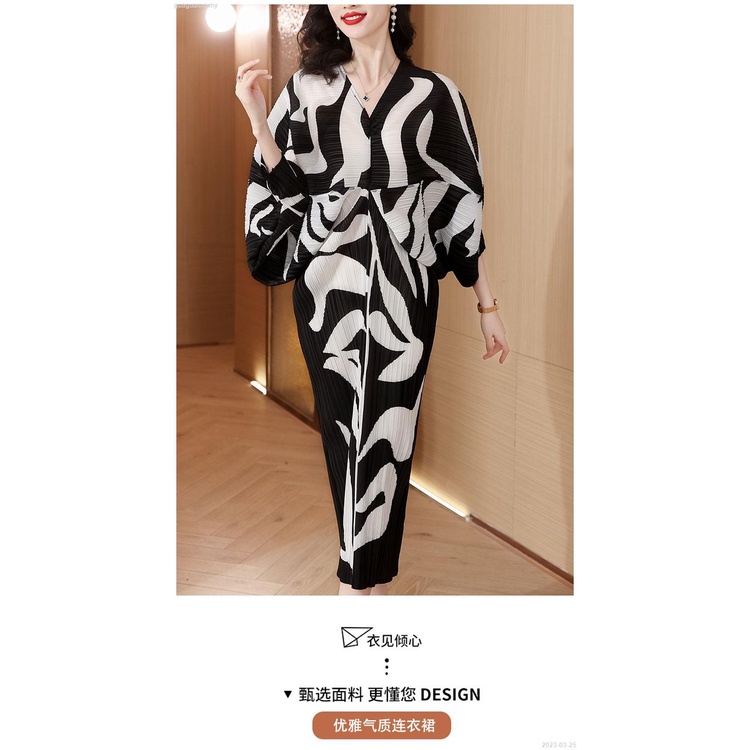 Pleated Dress 2022 Blue Print Slim Bat Sleeve Loose V-Neck Holiday Floral Dress - 2023-03-23
