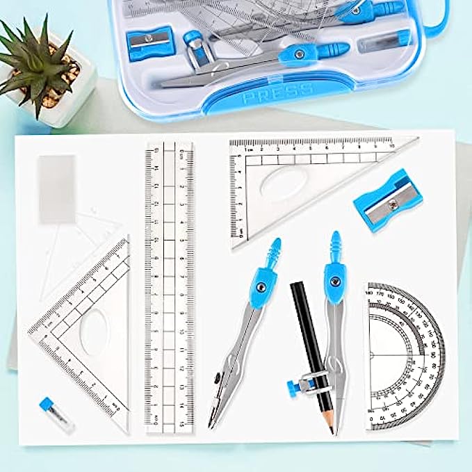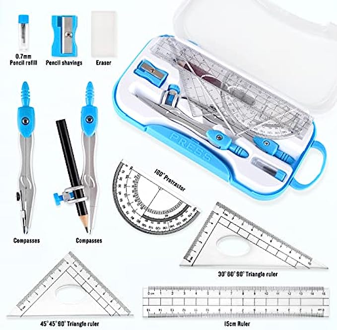 Professional Math Geometry Set, Compass for Geometry, 10 pcs Geometry Tool Set with Shatterproof Storage Box, Ruler Compass, Drafting Tools, School Supplies, Drawing Tools for Engineers Students
