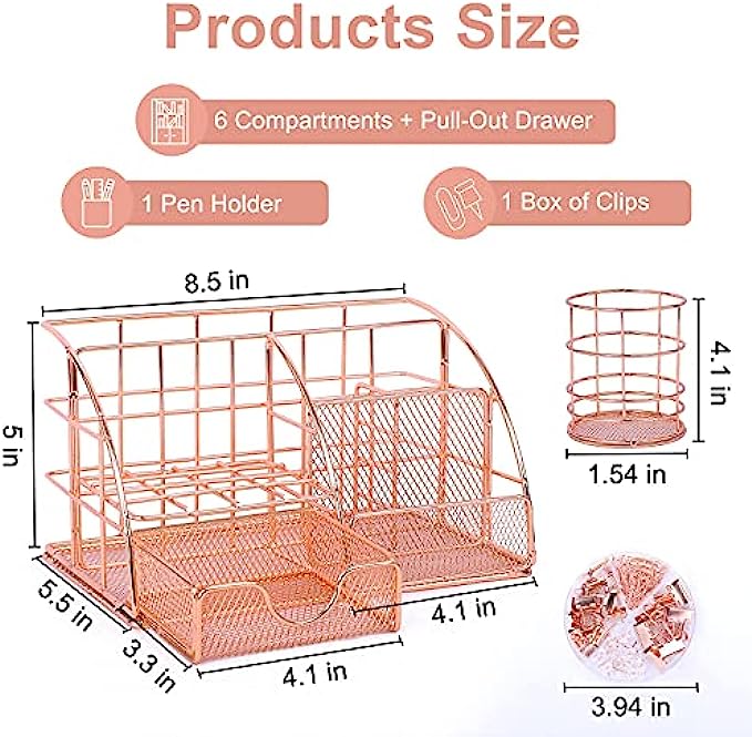 START YOUR ORGANIZER JOURNEY RIGHT AWAY:This stylish and modern rose gold desktop organizer features 6 compartments and 1 mini pull-out drawer. There are also come with a pen holder and a box of paper clips. Meet all your needs when organizing your desktop. Let's start to make changes and to be more creative all day!