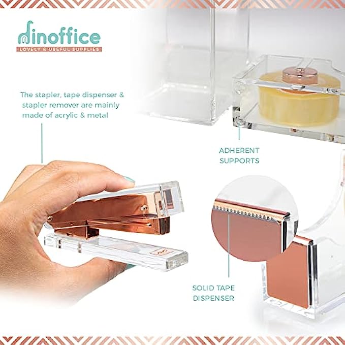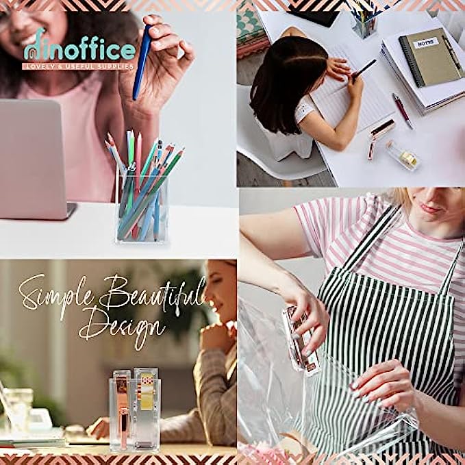Rose Gold Office Supplies and Accessories - Cute Desk Pink for Women Acrylic Pen Holder Clear Organizer Tape Dispenser Stapler Pencil Holders Organizers Aesthetic Marker Staples Supply Girl Boss Set
