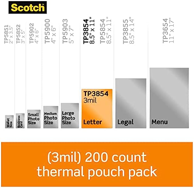 Scotch Thermal Laminating Pouches, 200-Pack, 8.9 x 11.4 Inches, Letter Size Sheets, Clear, 3-Mil (TP3854-200)