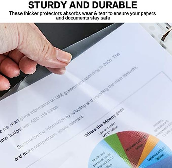 STURDY AND DURABLE: Our ultra lightweight sheet protectors that are enough thick to ensure your papers and documents stay safe for years to come. These protectors absorbs wear & tear, provides great performance, durability and frequent daily use at home, school or office for any documents you want to keep safe or that are frequently used, Archive safe with our PVC Free and Acid free design.