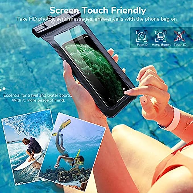 • ?[Friendly Reminder]: This waterproof pouch is not recommended for mobile phones with thick cases (e.g., OtterBox). Please remove the thick phone case before placing the phone into the dry bag. The phone may be affected by hydraulic pressure at certain water depths, which will affect the operation of the touch screen. In this case, please press the volume button to take photos. Not applicable to touch ID and fingerprint unlocking.