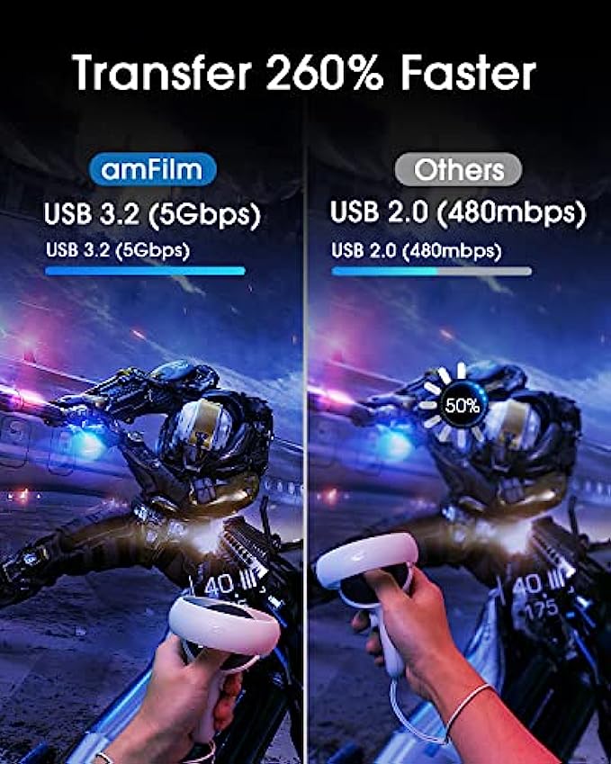 High-Speed Data Transfer: Oculus Quest 2/1 link cable provides up to 5Gb per second transfer speed. The smart chip's quick and stable data synchronization and continuous current bring you the highest rendering quality of your PC and a smooth gaming experience. An additional USB-A port enables compatibility with older PCs as well.