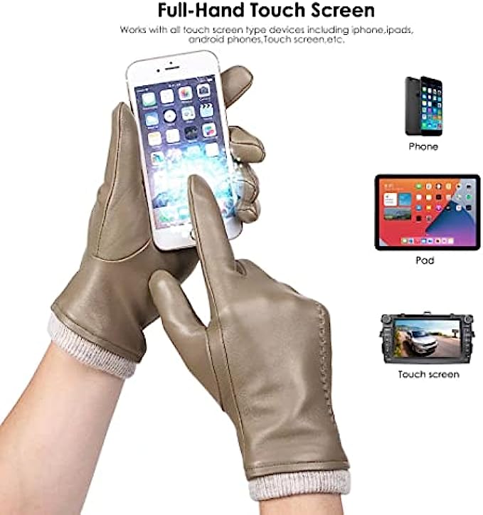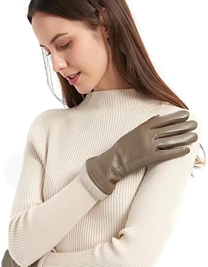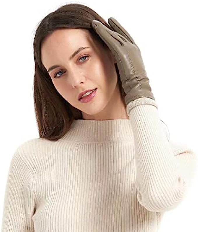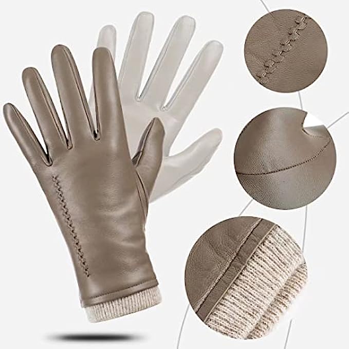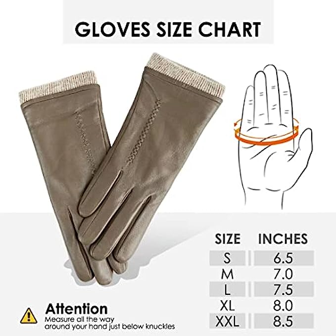 • 1.GENUINE LEATHER GLOVES: Outer are made of premium top layer genuine sheepskin leather with softness of touch, suppleness, strength and lasting comfort. Fully lined with Italian cashmere, let the gloves be your chic cold weather essentials.