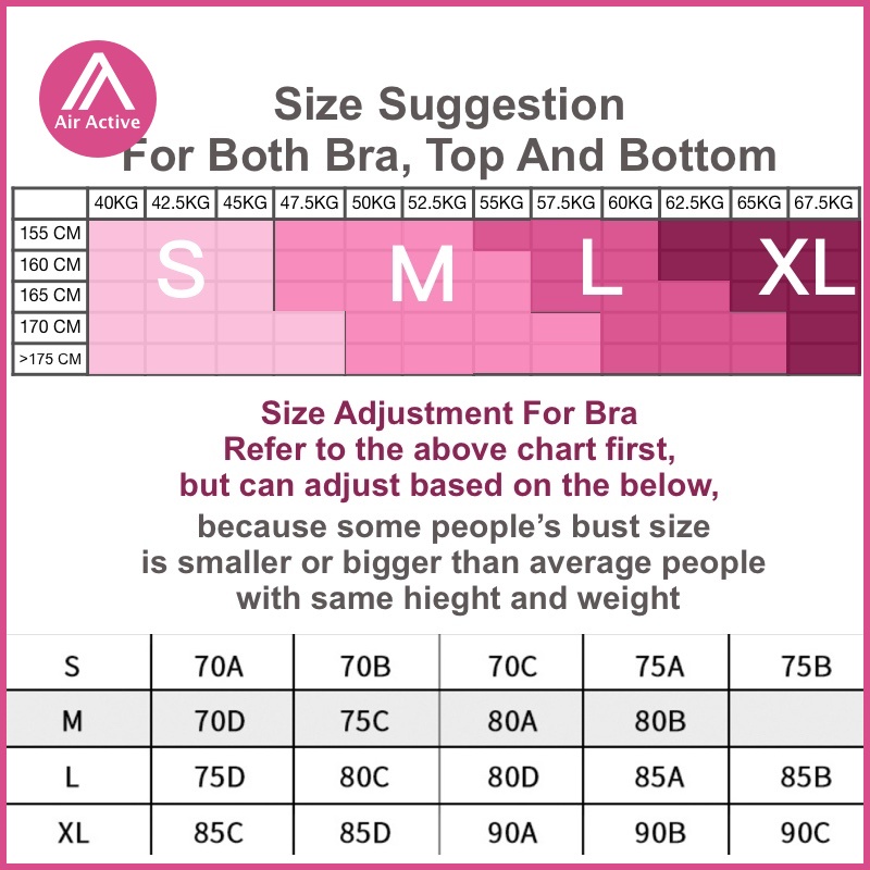 Appearance:Nice colour and soft fabric Quality:Good Performance:Suitable for low impact exercise The material feels soft and the colours are pretty. I wear UK 8-10 or 32B for clothes. After reading the reviews, I decided to size up to L for a comfortably fit. Might consider M size next time as there is small gap in the under-bust band. Height 172cm/ 54kg/27” under bust