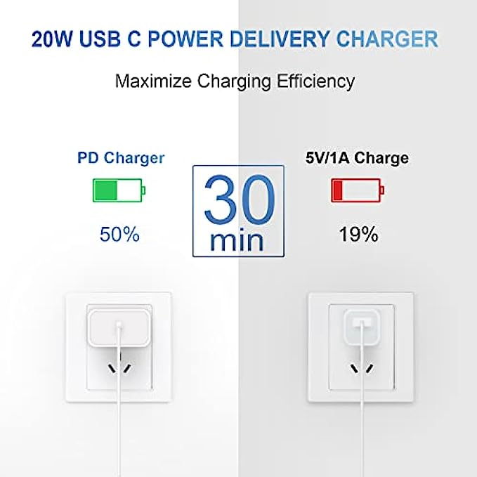 [Fast Wall Charger]20W PD USB Type C power delivery wall plug, PD adapter 3.0 Quickly Charge USB C port provides Max 20W output power, charge your device up to 3x faster than the original 5 W charger, charging your iPhone up to 50% in just 30 minutes for iPhone Charging, At 3A Maximum, Helps You Work Efficiently.