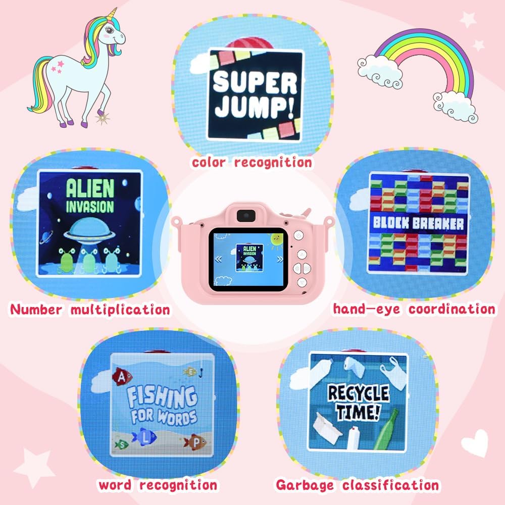 Kids Camera, 1080P Kids Digital Camera with 32GB TF Card,Unicorn Camera Cover/HD Video /5 Educational Games/8x Zoom/46 Photo Frames & Filters,Gifts for Boys Girls Age 3-8 (Pink)