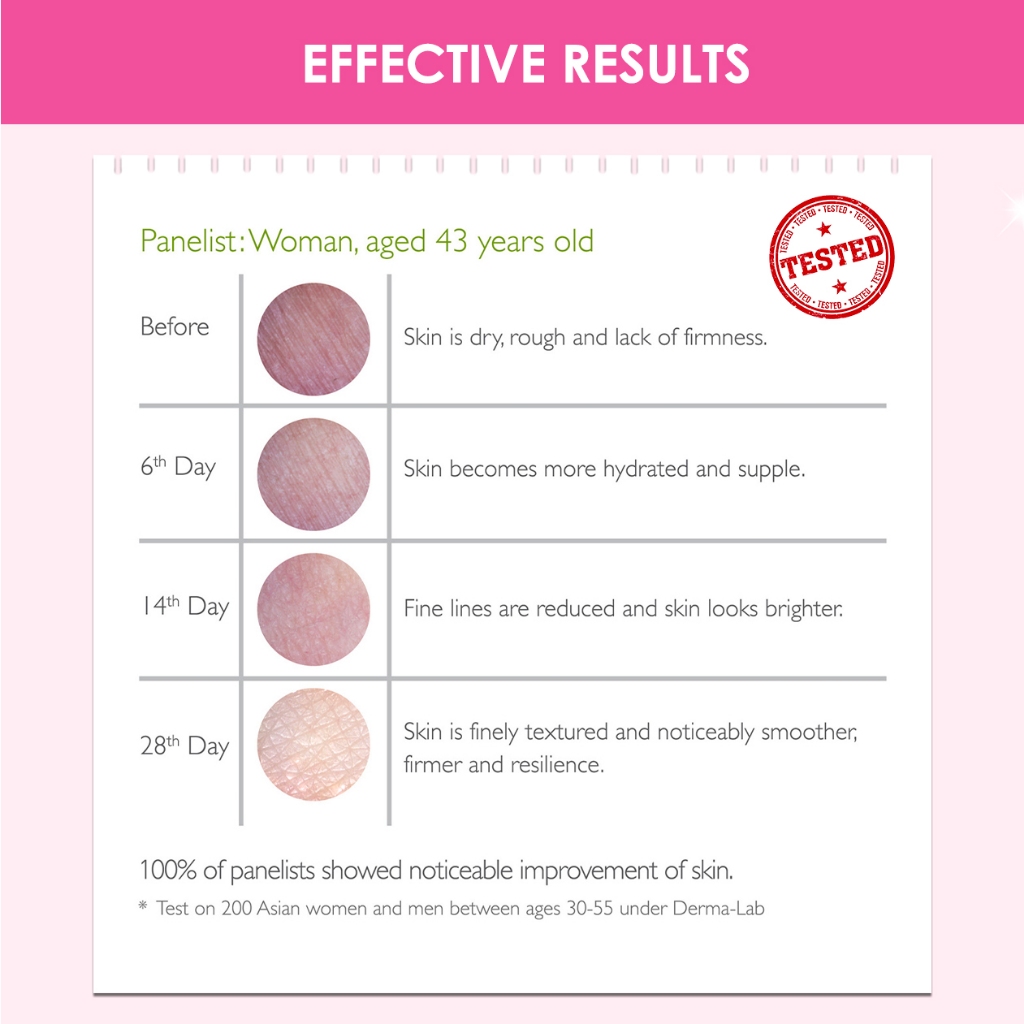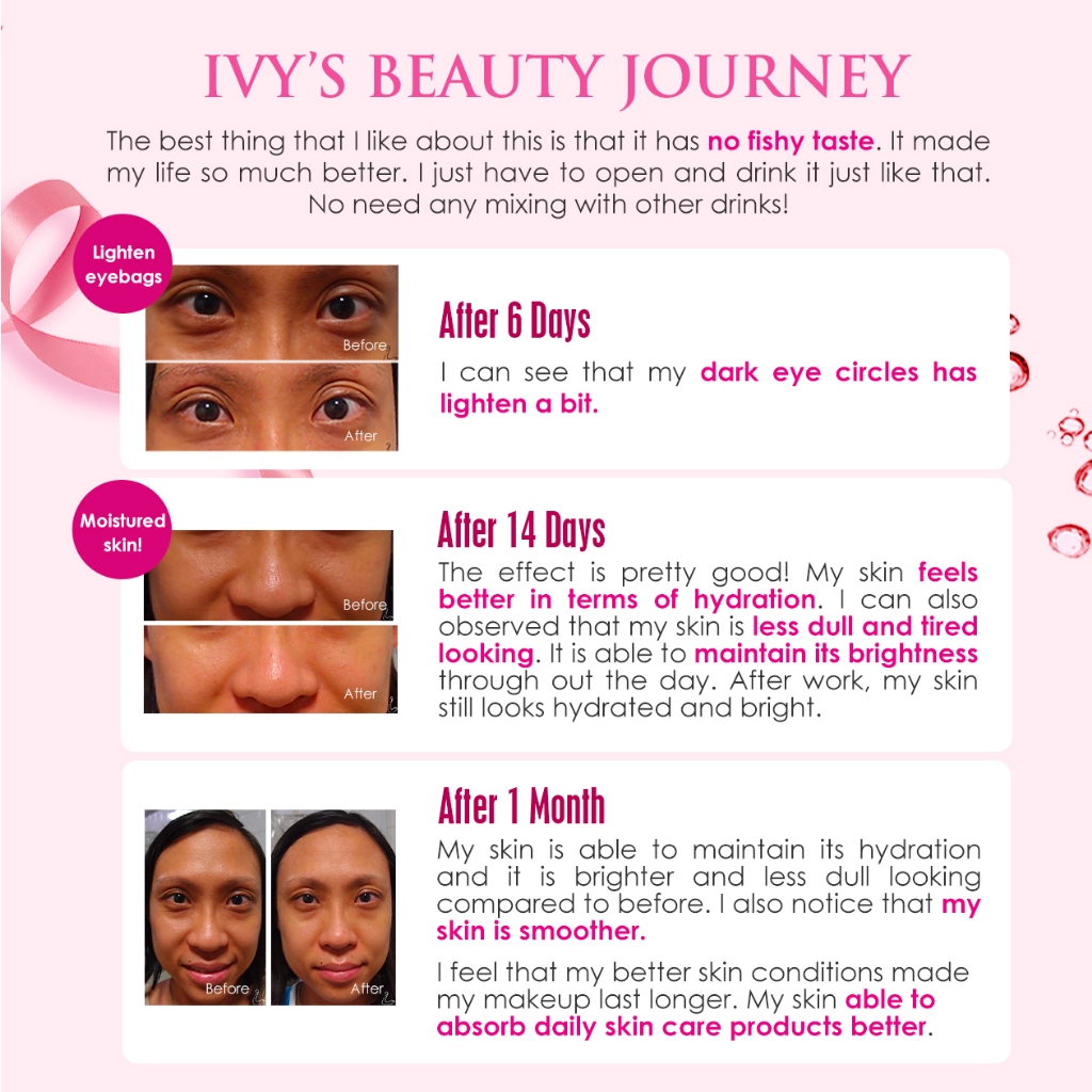 Suitability:yes Performance:good Delivery came after 2 days of ordering via ninja van. This is my 2nd purchase. After consuming 2 boxes over 3 months, I really feel there is a difference in my skin (both facial, arms & legs). More moisture and youthful. Used to apply moisture to my arms and legs but it is not enough. Enjoyed this maintenance as it is also very delicious. Thank you seller for the gifts too! ❤️