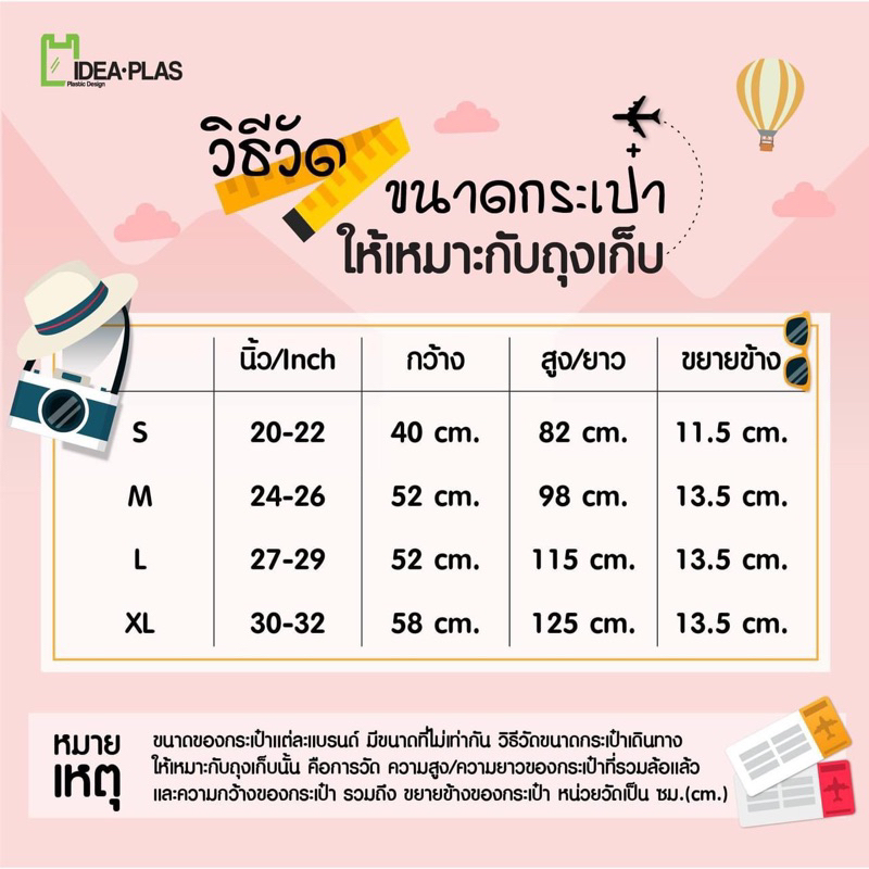 Details Size 58 Cm (width) + side extension 13.5 Cm x 125 Cm (length) Quantity 1 piece per pack Weight 150 grams of weight Features Made of good quality plastic, texture is thicker than general bags. Open and close the bag with a drawstring with a lock rope, convenient to use Used to store dustproof, suitable for storing a 32-inch suitcase (measured from the height of the bag, not including wheels) Method