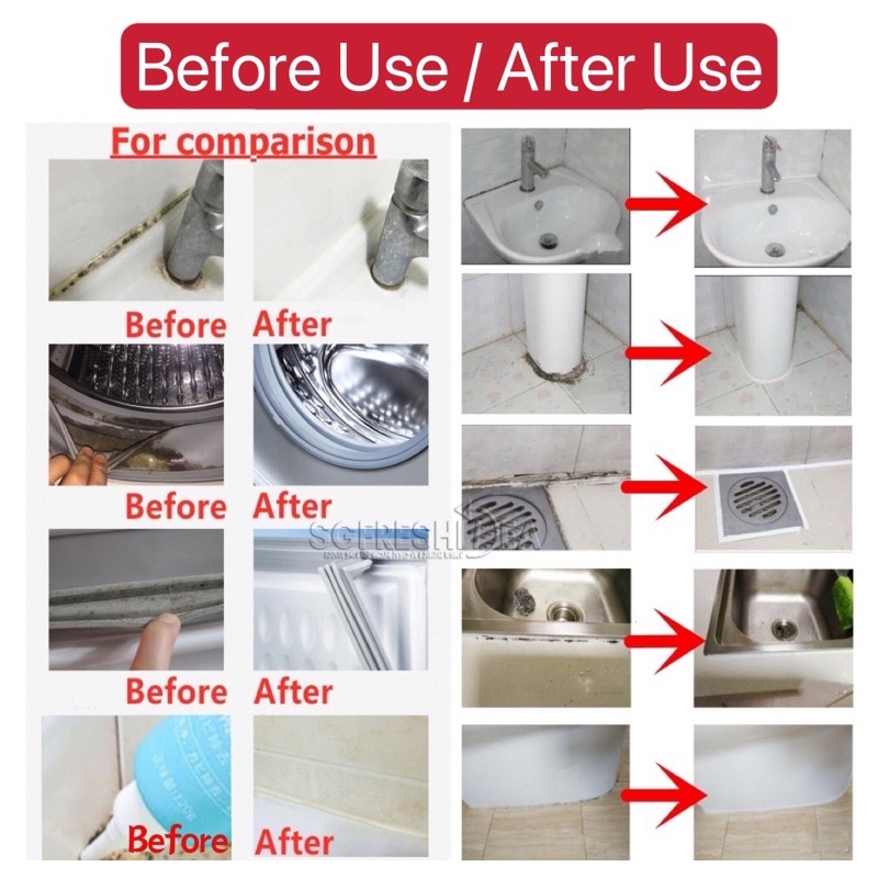 Performance:"真的那么神奇吗?" my hubby asked. Few days later he is wowed. First 2 photos are before application, next 2 photos after application. I applied about 3 times, wiped and reapplied after a day or two. It's about 98% cleaned now. It works also on the corners of caesarstone. Happy that the mold is no longer an eyesore now.
