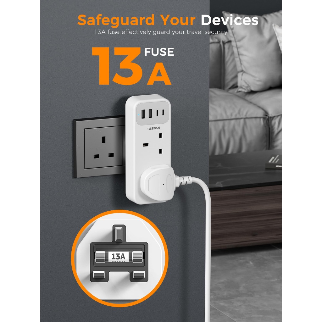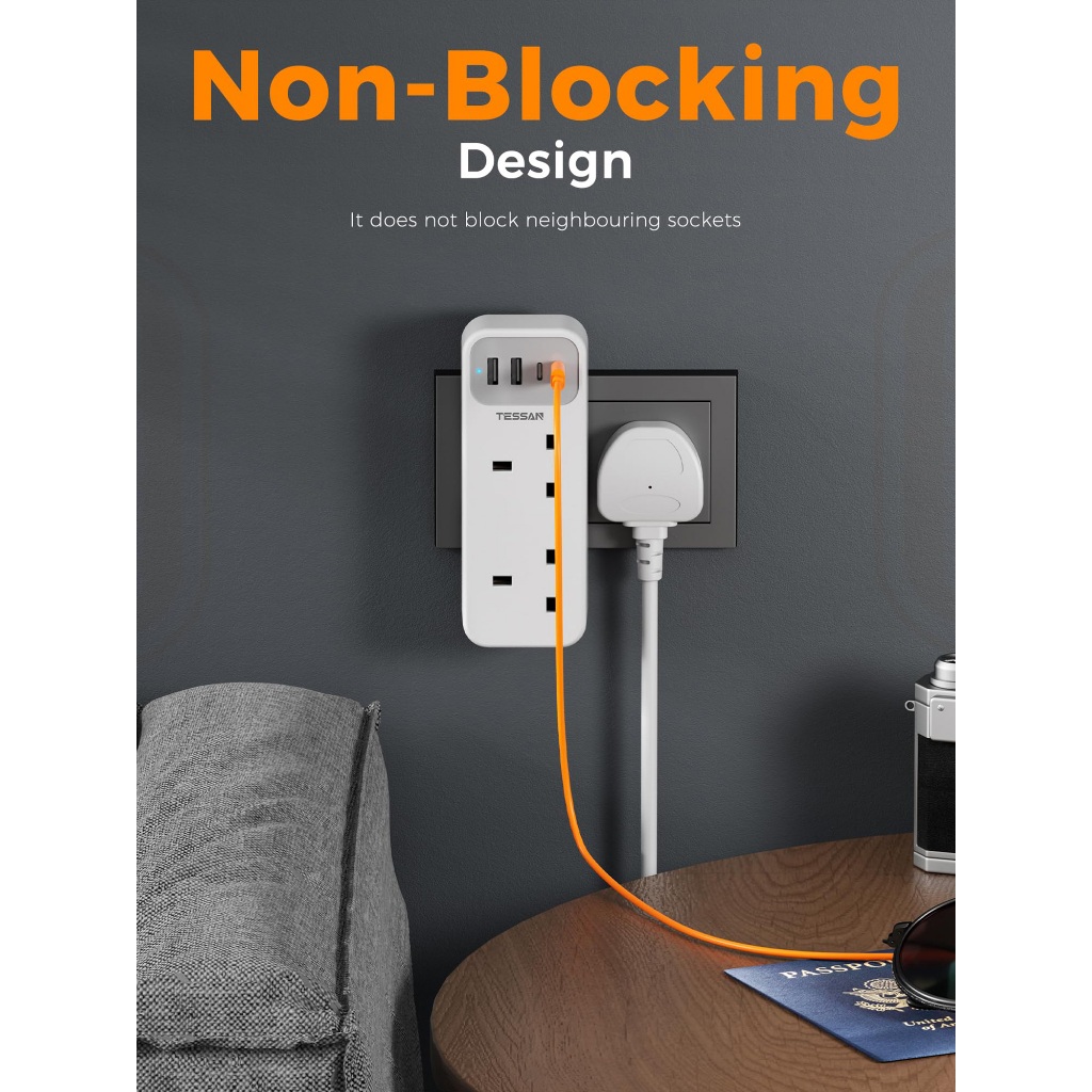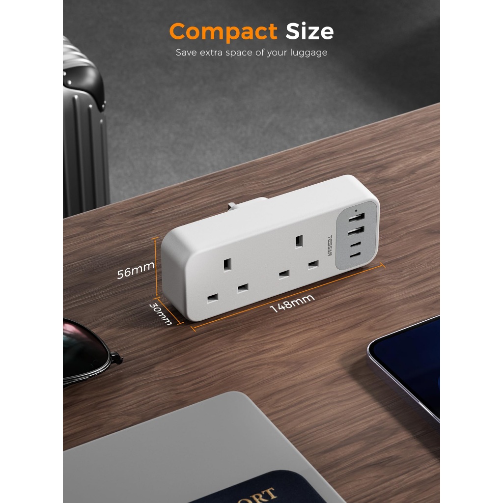 TESSAN Multi Plug Extension Adapter with USB and Type C,2 Way Power Extension Socket Wall plug