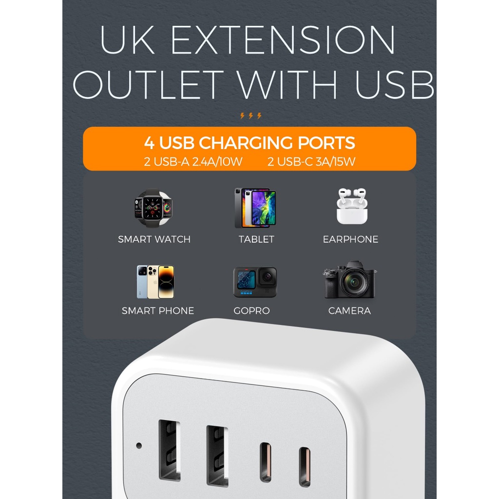 Best Feature(s):USB and type C adapter Value For Money:yes Performance:good Good purchase. It suits my need as my items are near to the wall socket.