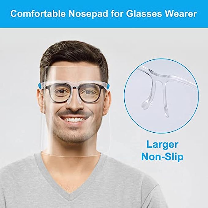 【10 PACK of face shield】Durable, lightweight, and comfortable protective face shields that are made with ultra-clear elastic and thick plastic. Each face shield contains an individual acrylic glasses frame, so you can get 10 complete Face shields with High quality glasses frames. When wearing glasses over your ears and on your nose bridge, this face shield protecting you will provide good protection as well as comfort. One size fits all and could be shared with families and friends.