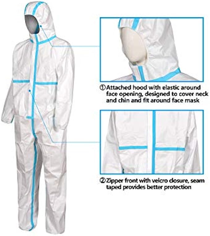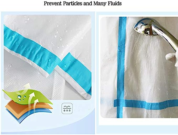 Zipper front with protective storm flap, attached hood, elastic wrists and ankles help prevent splashes from reaching clothing or skin. Hood with elastic around face opening, designed to cover neck and chin and fit around face mask.