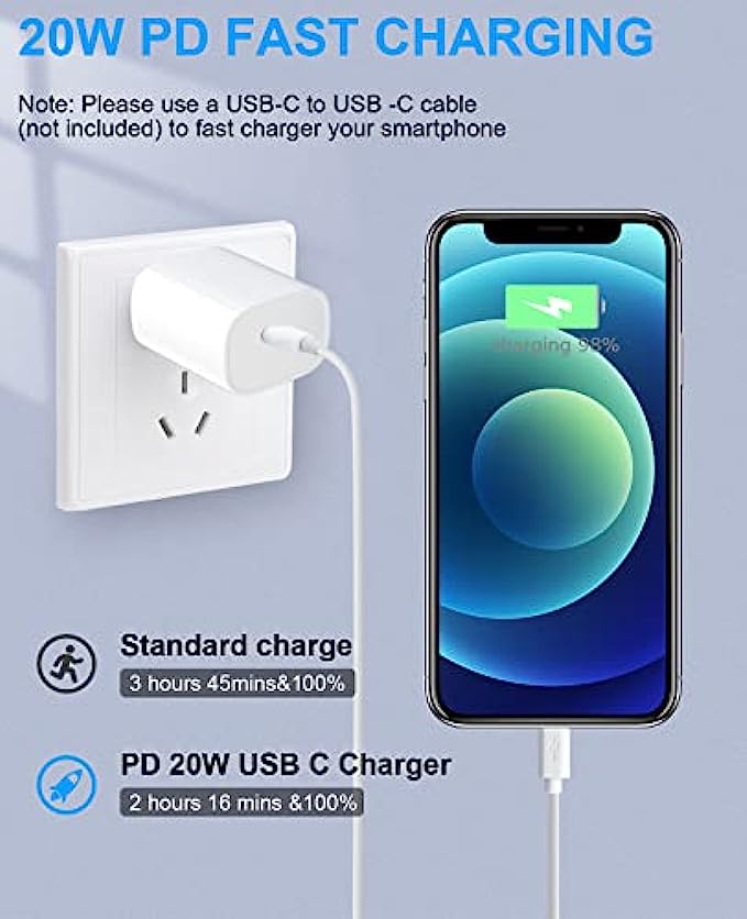 【3X Fast Charger iPhone】20W USB C iPhone fast charger with 10ft USB C to lightning cord, PD 3.0 quickly charge USB C port provides 3x faster charging speed than original 5W iphone chargers do. It can charge iPhone 13, iPhone 12 up to 50% in just 30 minutes which saves more time for you.
